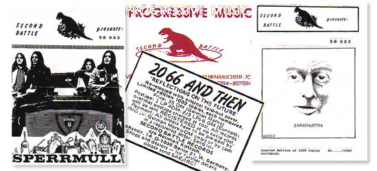 Mit neuen Bankdrediten gestärkt, geht Second Battle auf Jagd im Krautrock-Dschungel zu Hause waren. Dazu gehören Schallplattenfirmen, Verlage und Produzenten, aber auch Musiker, die per "Weckruf" auf nüchternen Magen an ihre Jugendsünden erinnert werden, wie beispielsweise Ernst Herzner oder Harald Kaiser. Second Battle produziert Reissues von ZARATHUSTRA (SB 002), SPERRMÜLL (SB 003) und dem ELOY-Debüt (SB 004) - wieder alles 1000er Auflagen. Dafür wird ordentlich die Werbetrommel gerührt. Damals übrigens noch echt handgemacht und machmal ein wenig "patchy"